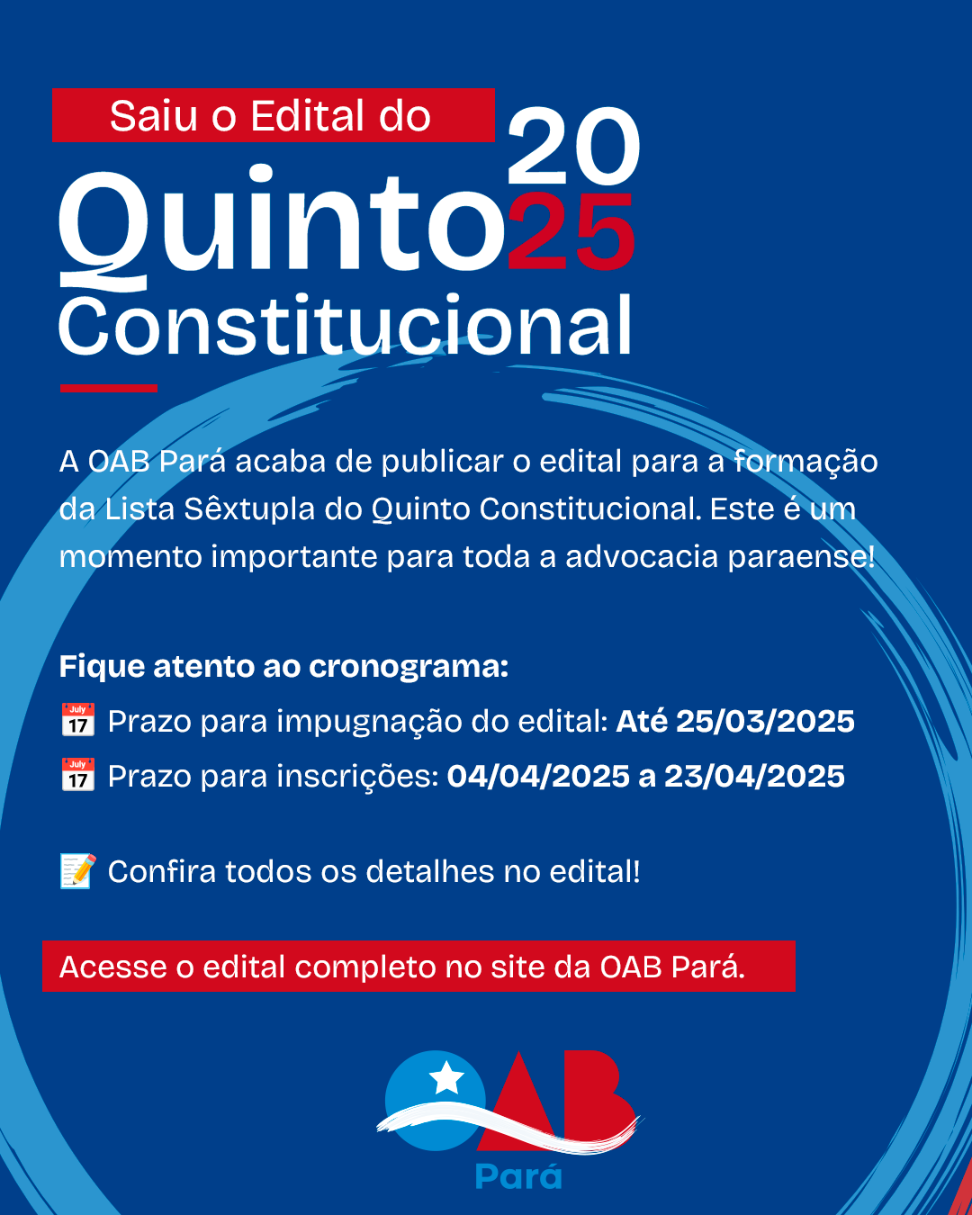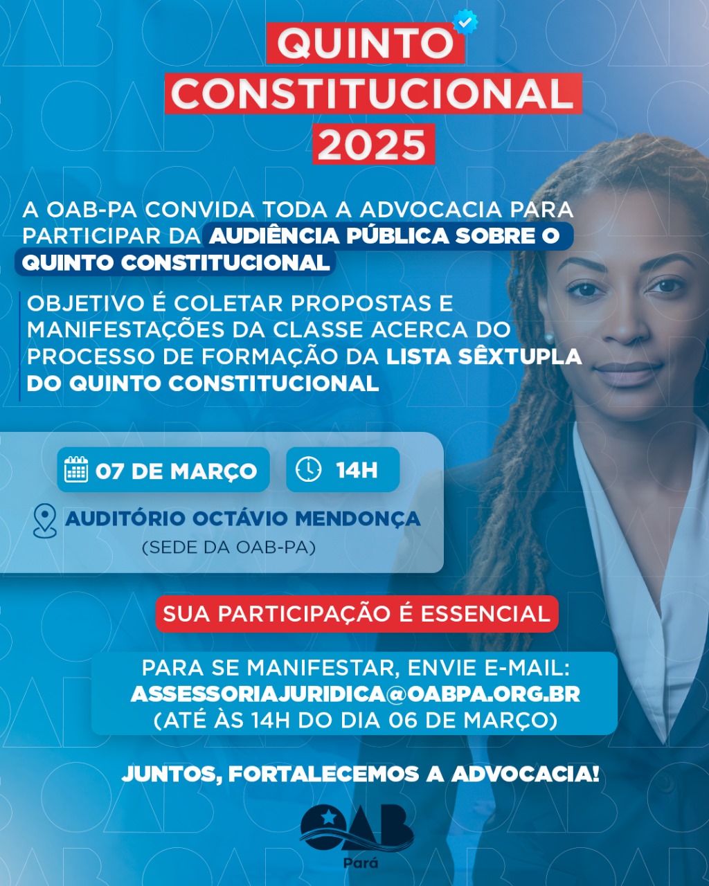 Quinto Constitucional 2025: OAB-PA realizará Audiência Pública no próximo dia 07 de março. Participe!